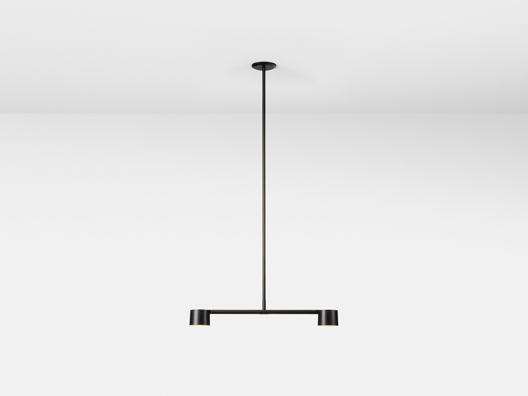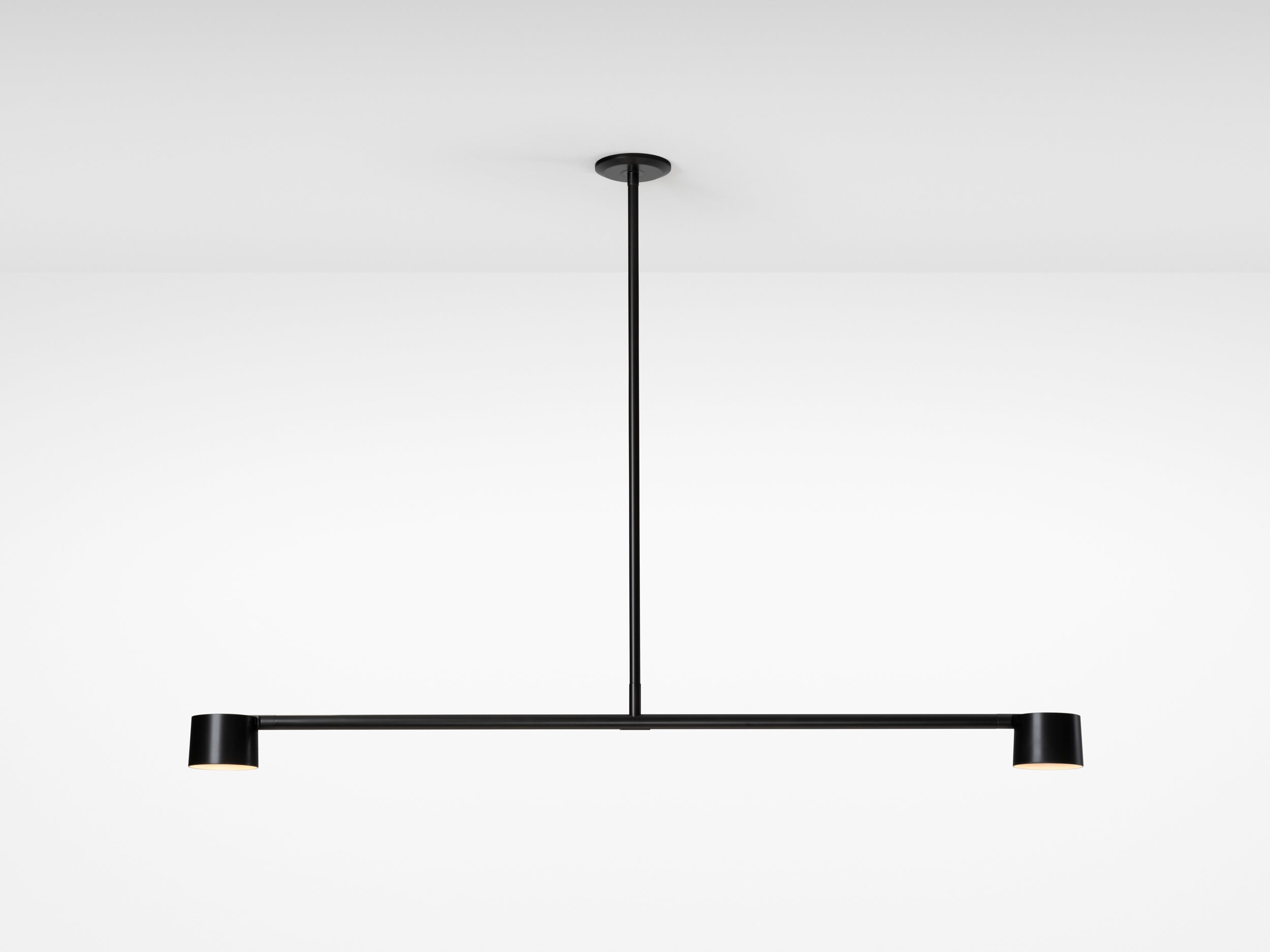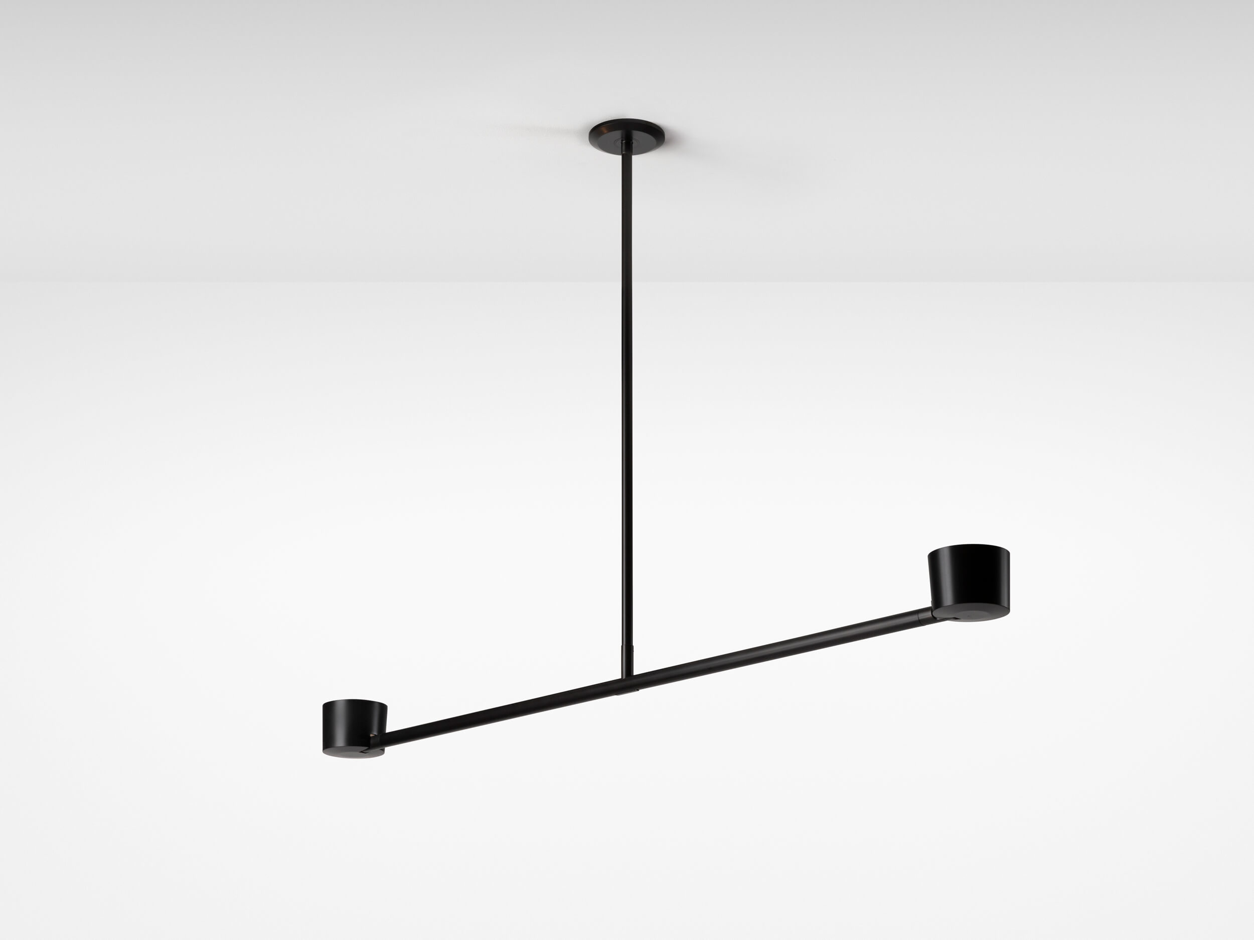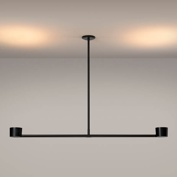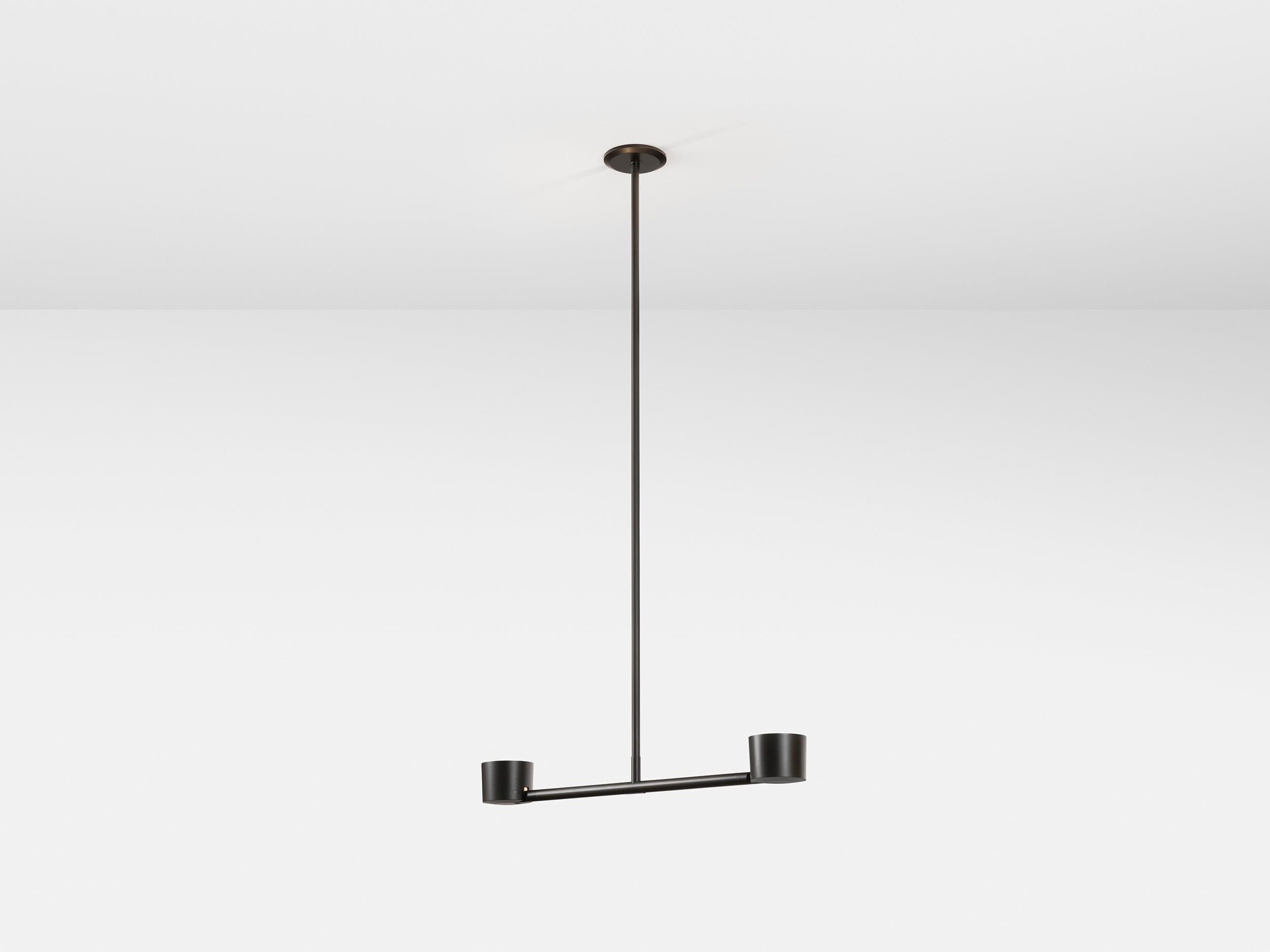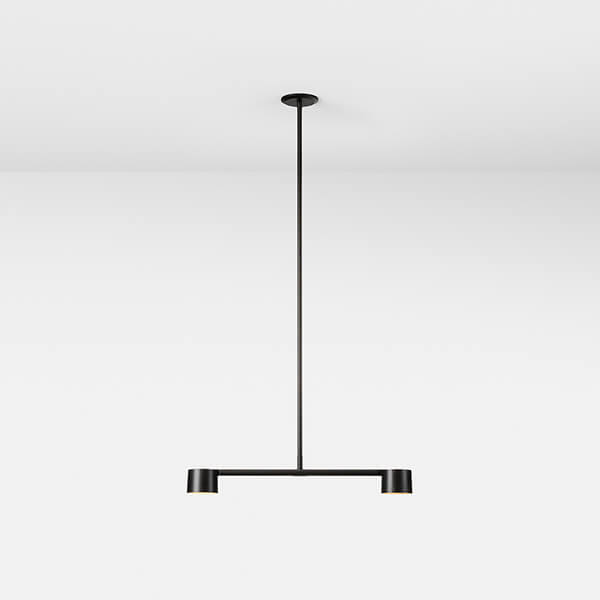 Designed to reveal the articulating mechanism with a subtle offset of components the double pendant achieves a refined balance. Precision machined from solid blocks of brass or steel, the shades can be angled up or down.