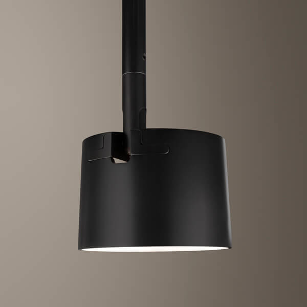 The shade can be angled with an articulation mechanism that is discretely housed inside the shade.