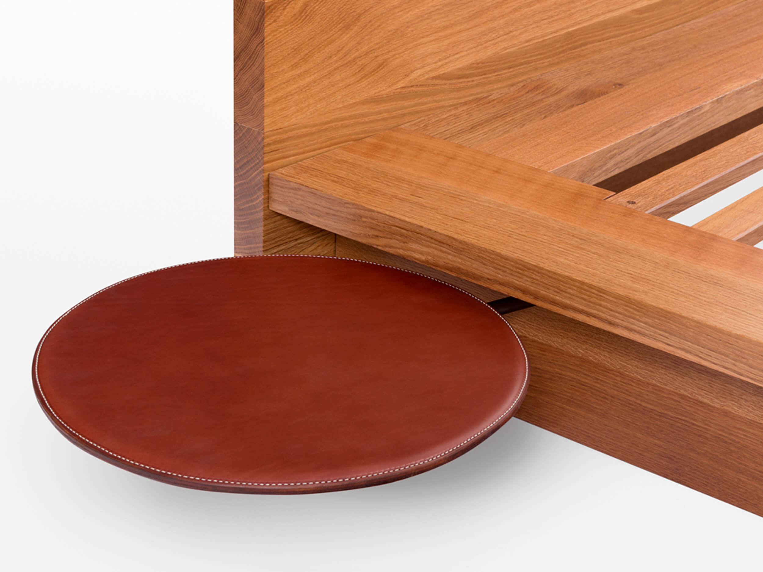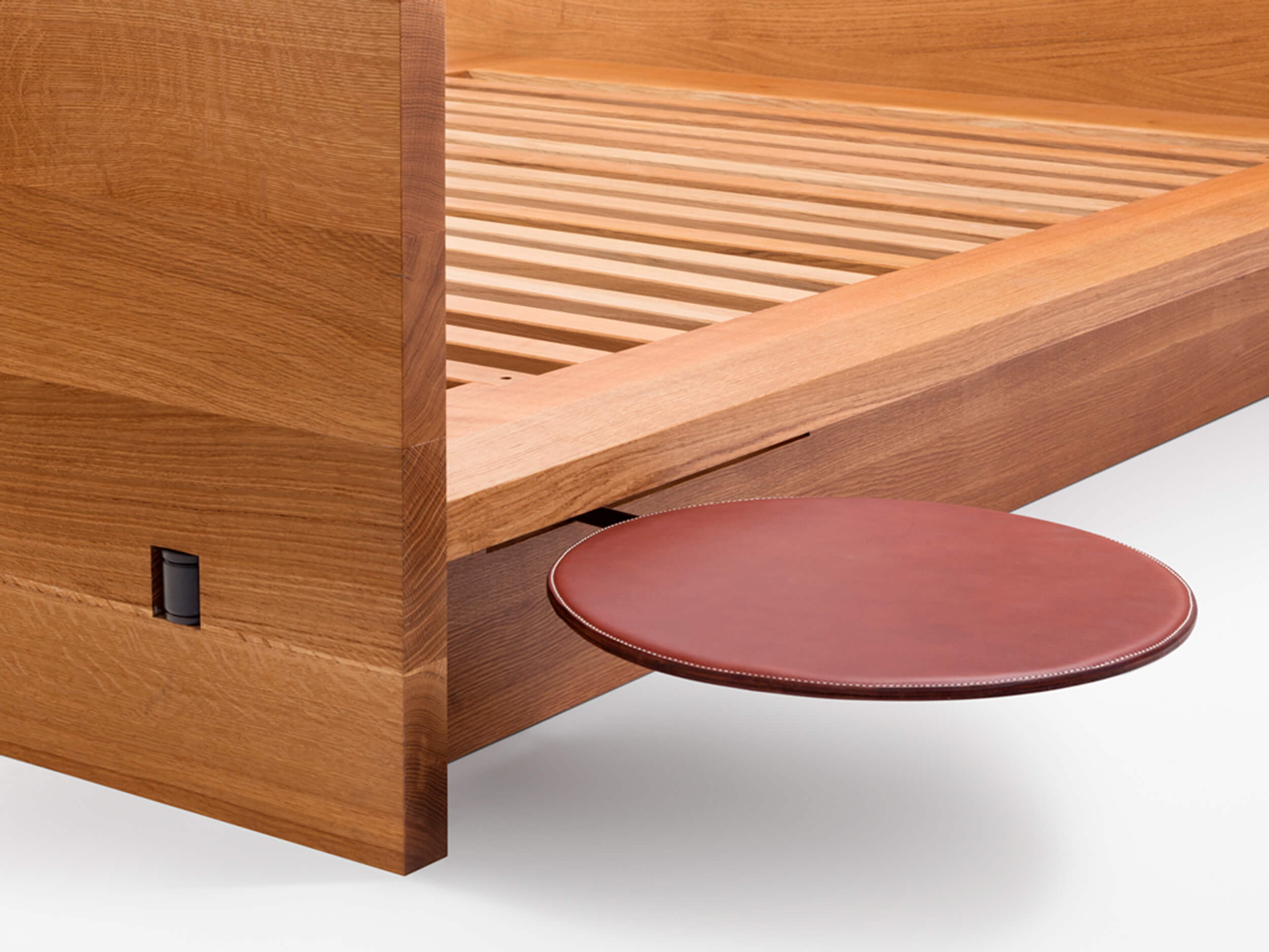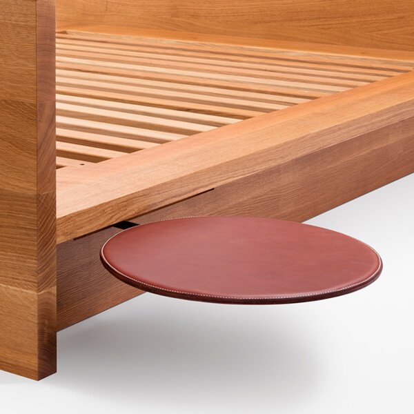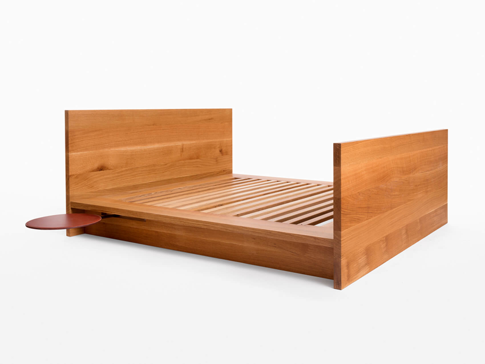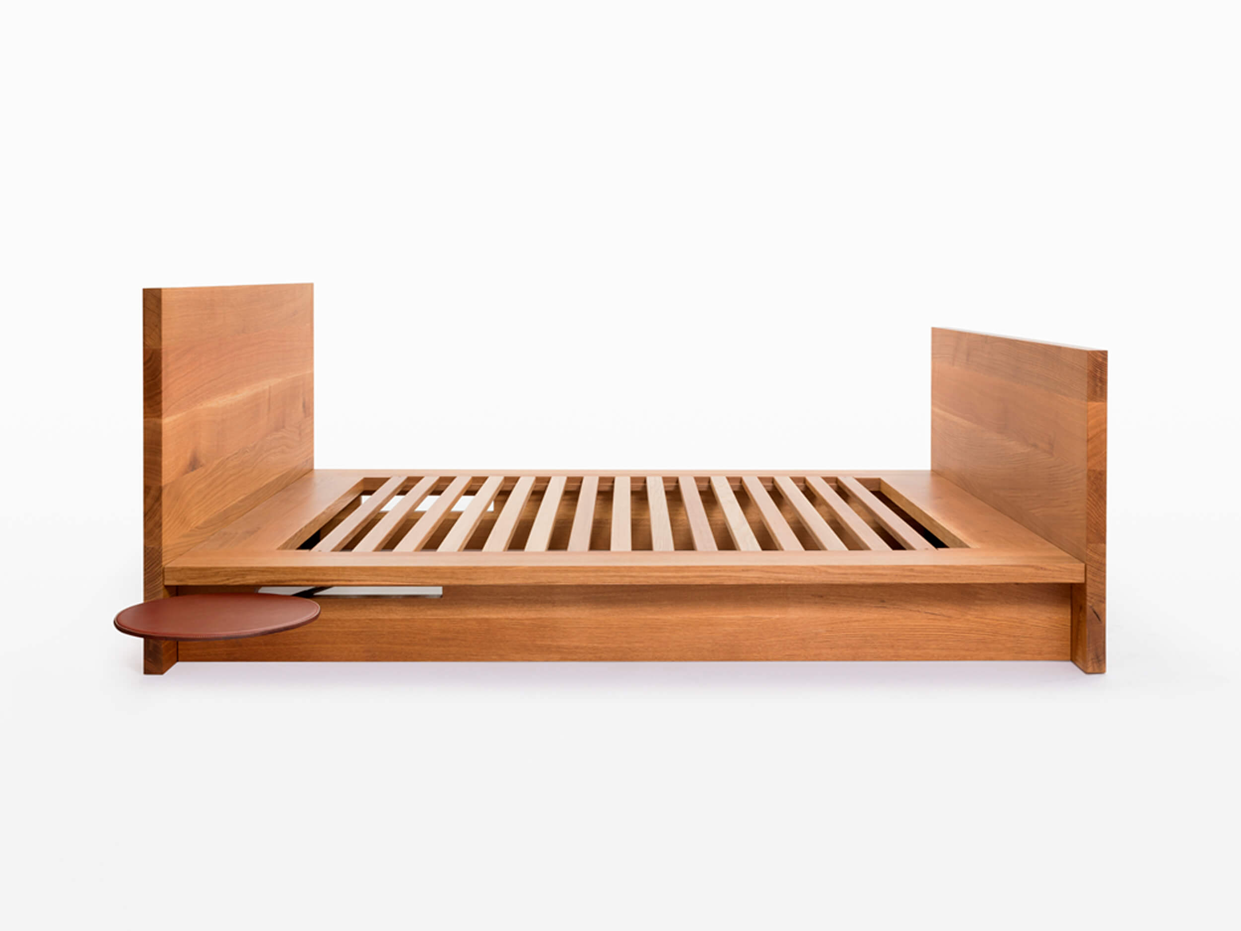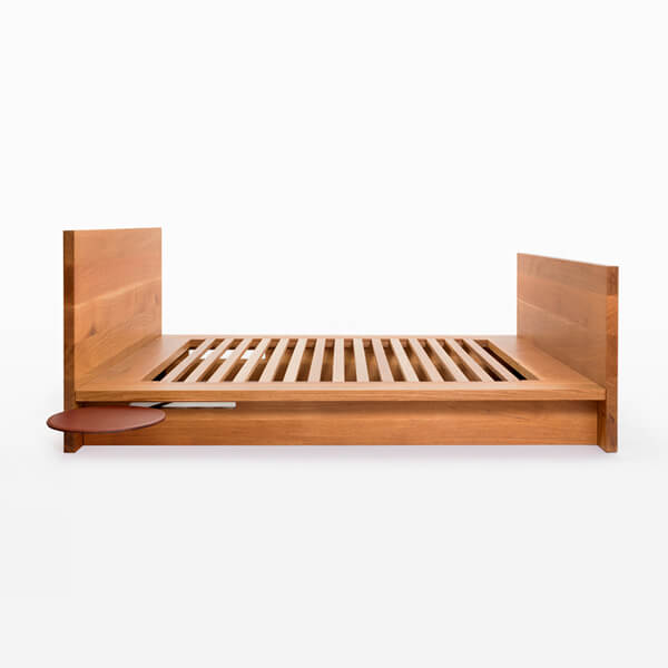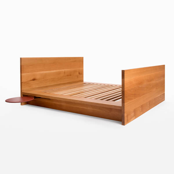 Hardwood bed with optional leather pivot table or leather and steel tray