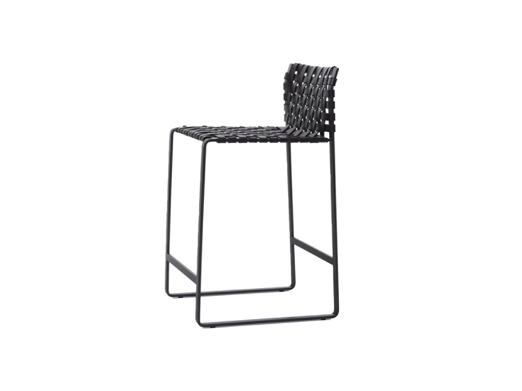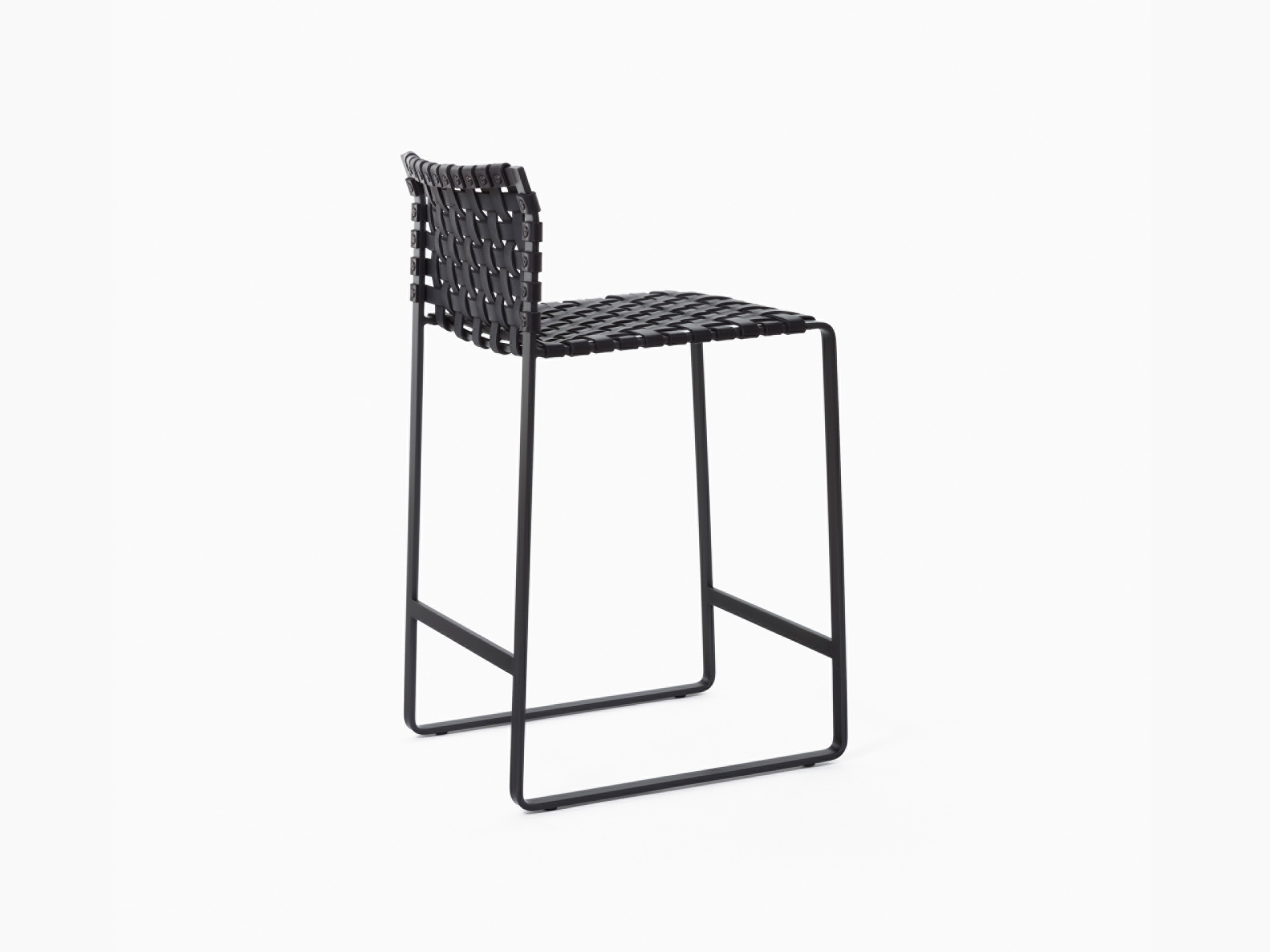 The Low Woven Back Stool combines the comfort of a woven leather back with a streamlined profile that remains under the sight line of the counter or bar.