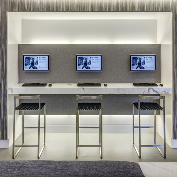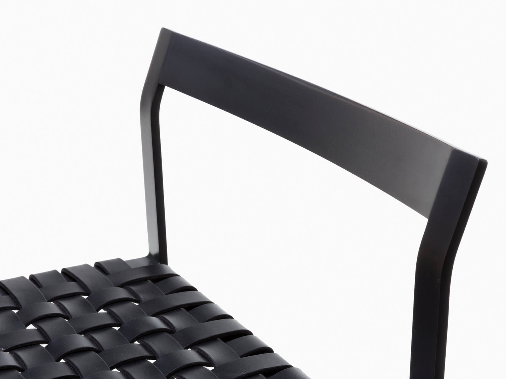 The low profile of the open back allows for the horizontal lines of the architecture to dominate without compromising comfort. The metal back is wide enough and curved just right to provide excellent lumbar support and an unnoticed yet crucial tapered radius on the edge of the back makes the back “soft”.