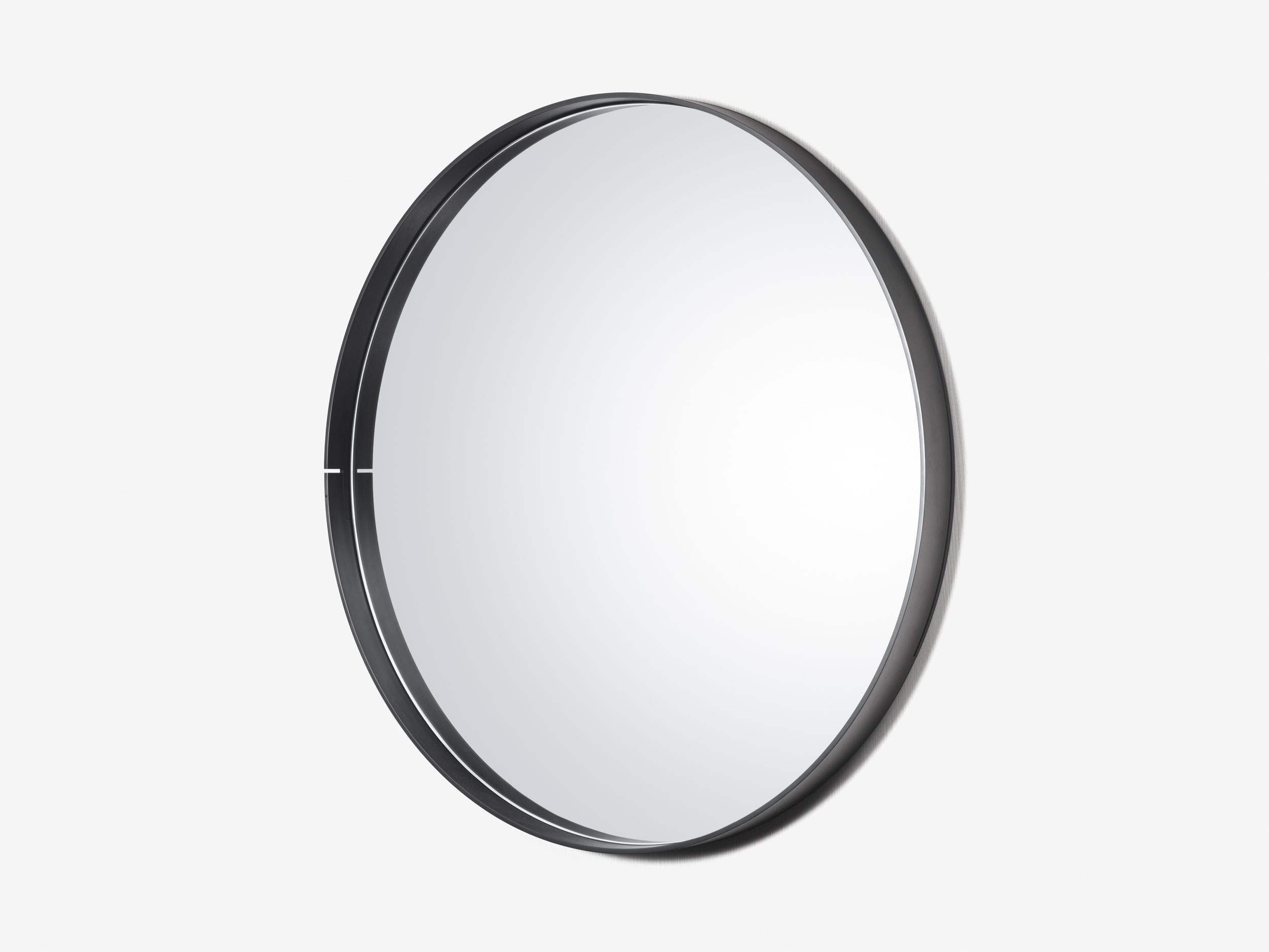 A round mirror with intimate details. A single bar of steel or brass is rolled into a ring and precision machined by hand to connect the ends with a half lap joint, commonly found in traditional woodworking.