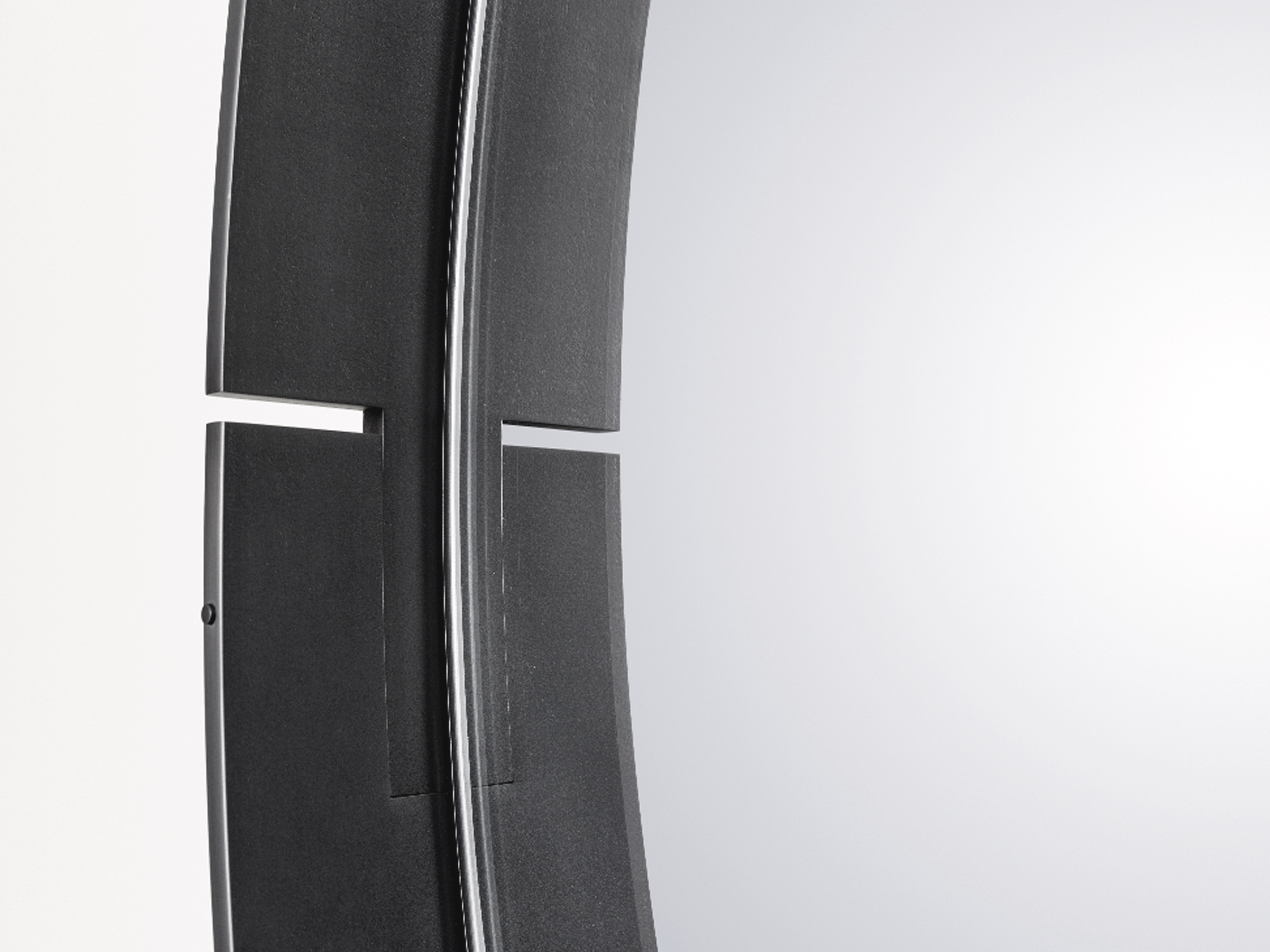-Chamfered (beveled) steel or brass plates are machined to match the outer frame and reveal the construction of how the frame and mirror are held together.