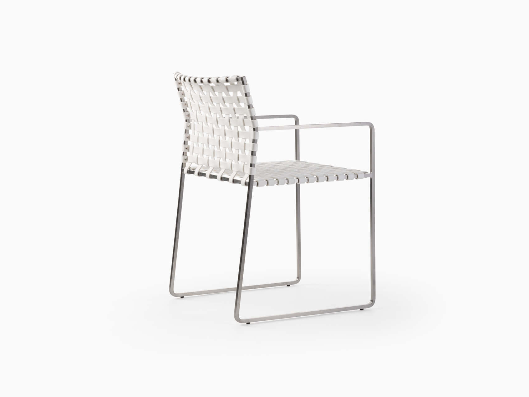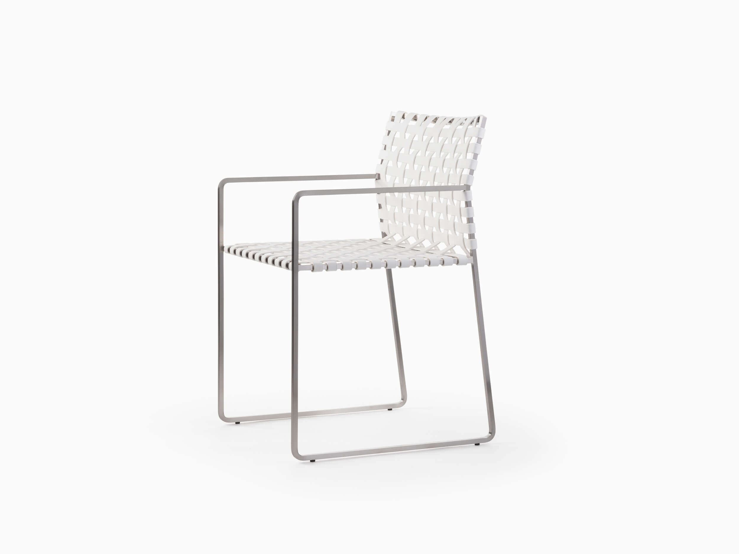The outdoor arm chair has a lighter frame than the standard arm chair and is woven with UV resistant, waterproof, faux leather strapping.