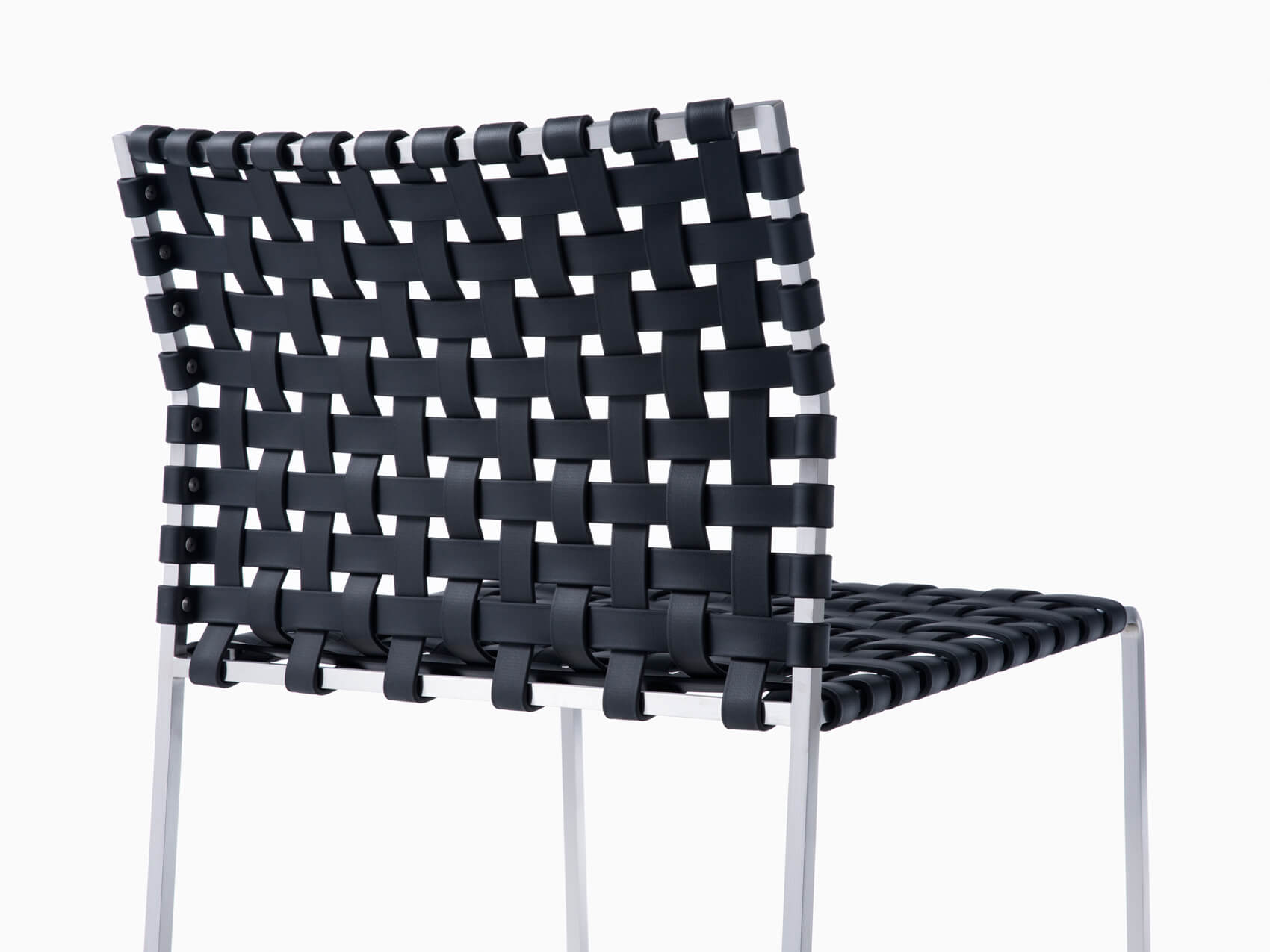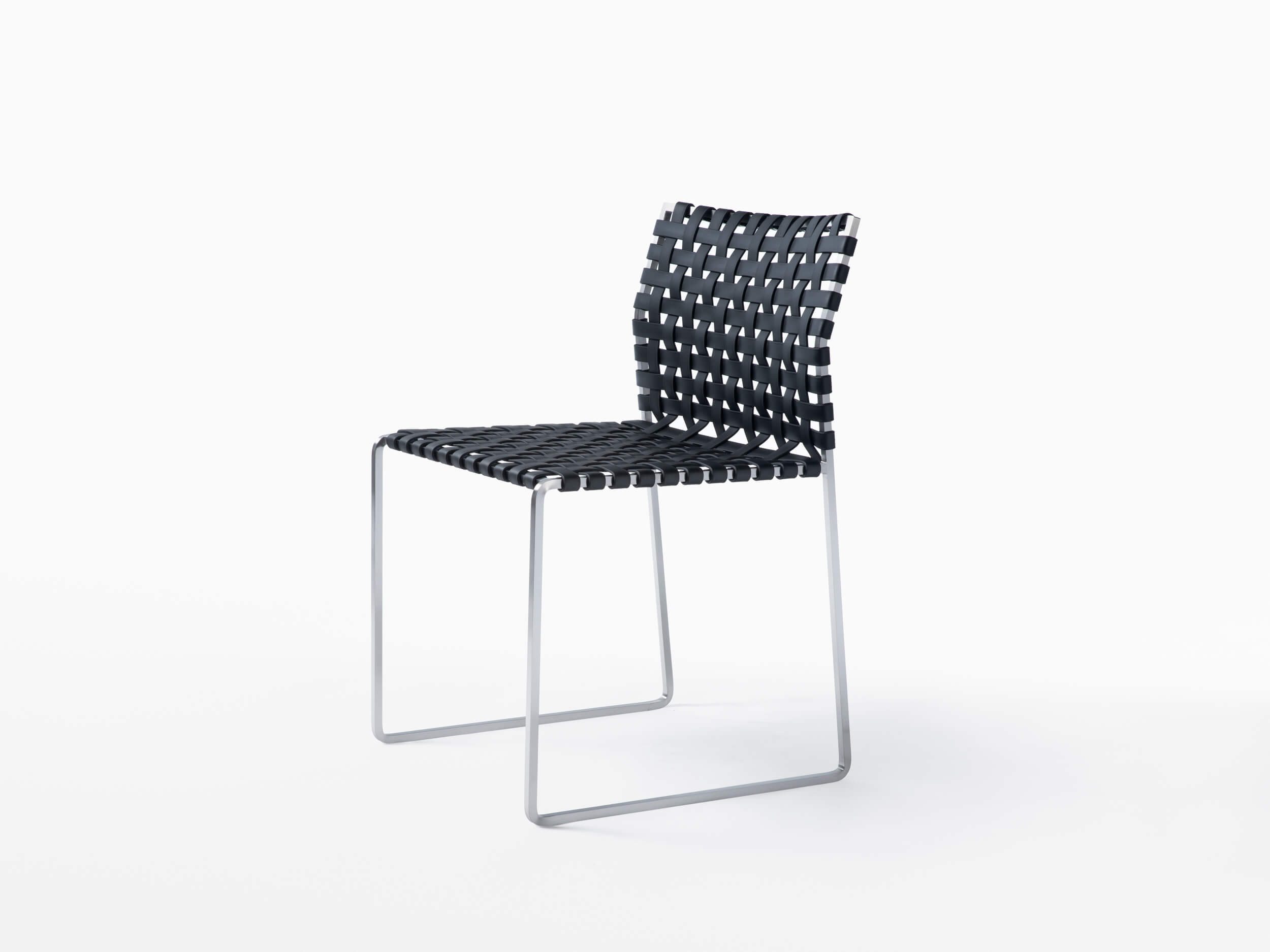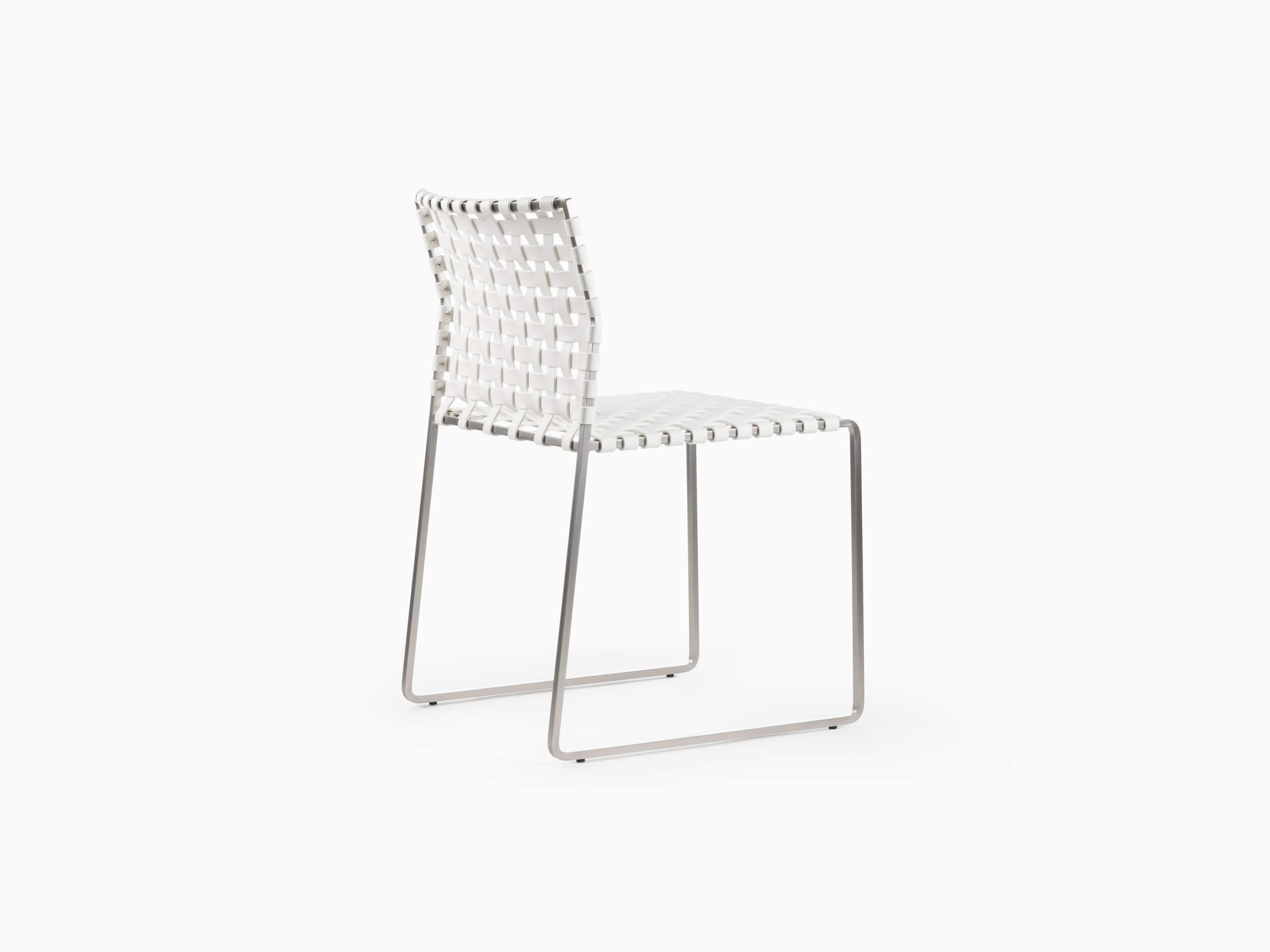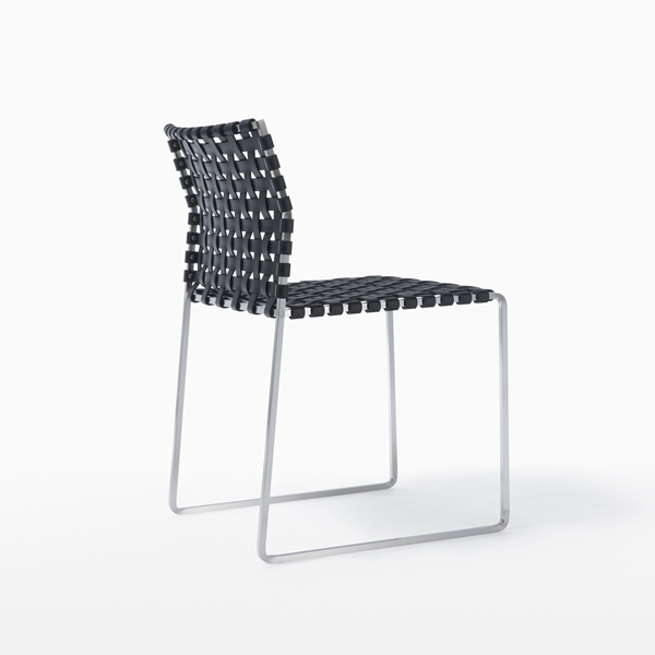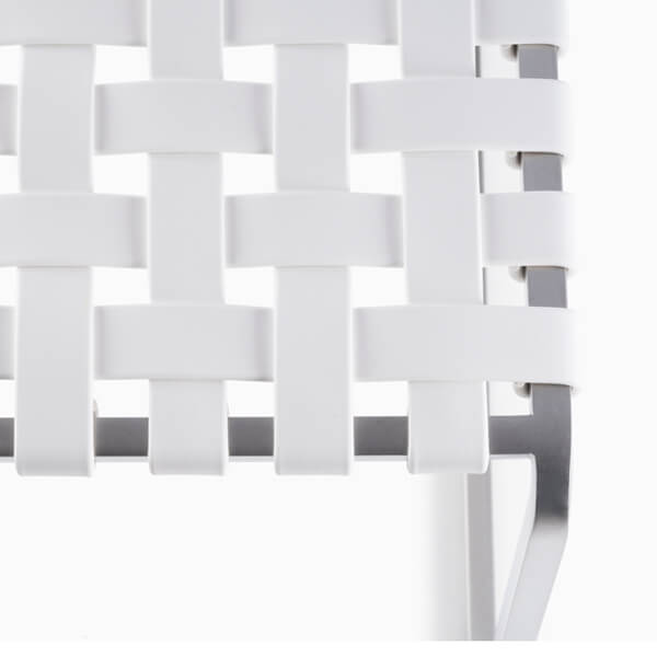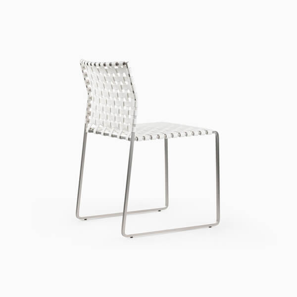 The outdoor side chair has a lighter frame than the standard side chair and is woven with UV resistant, waterproof, faux leather strapping.