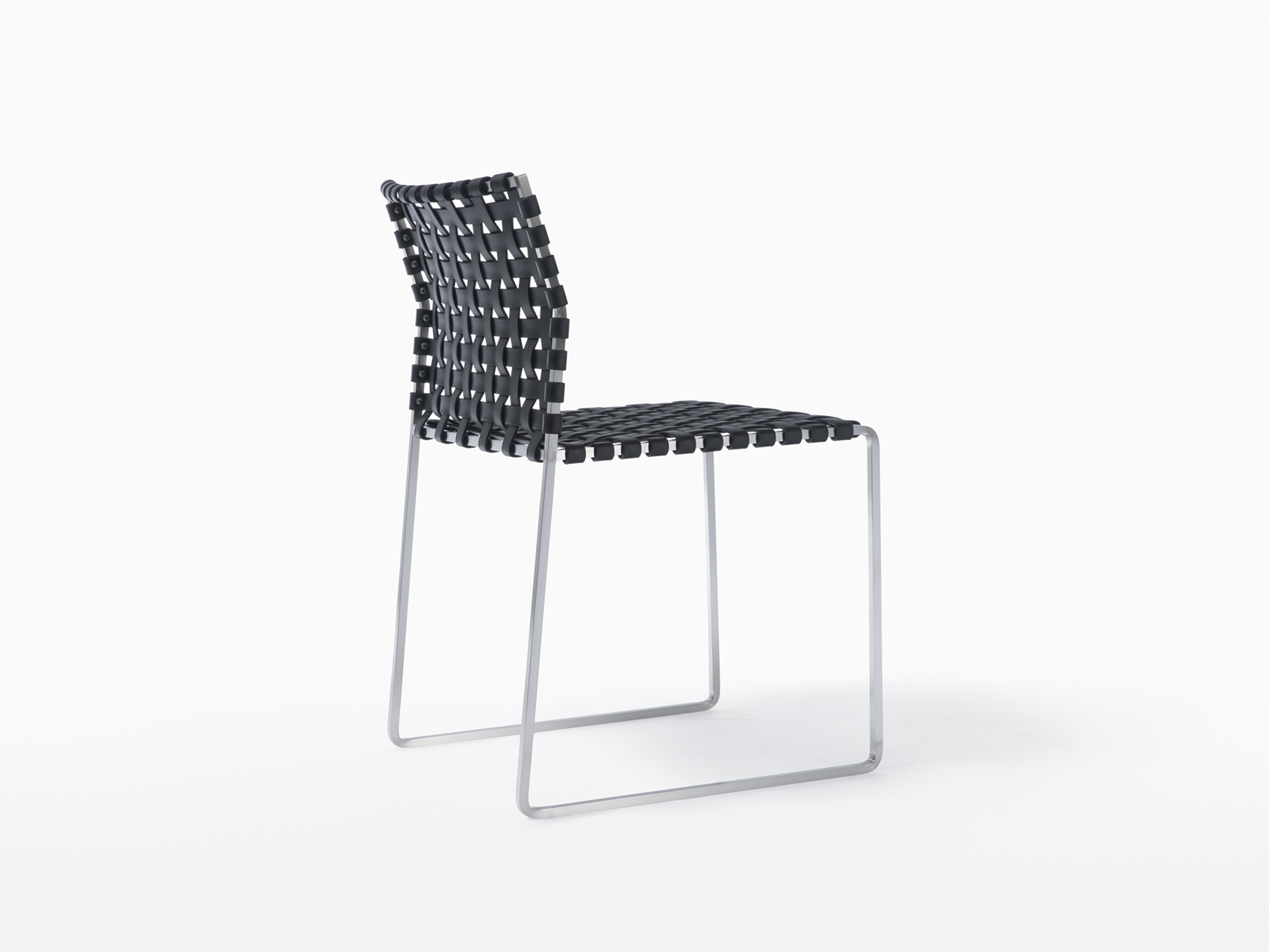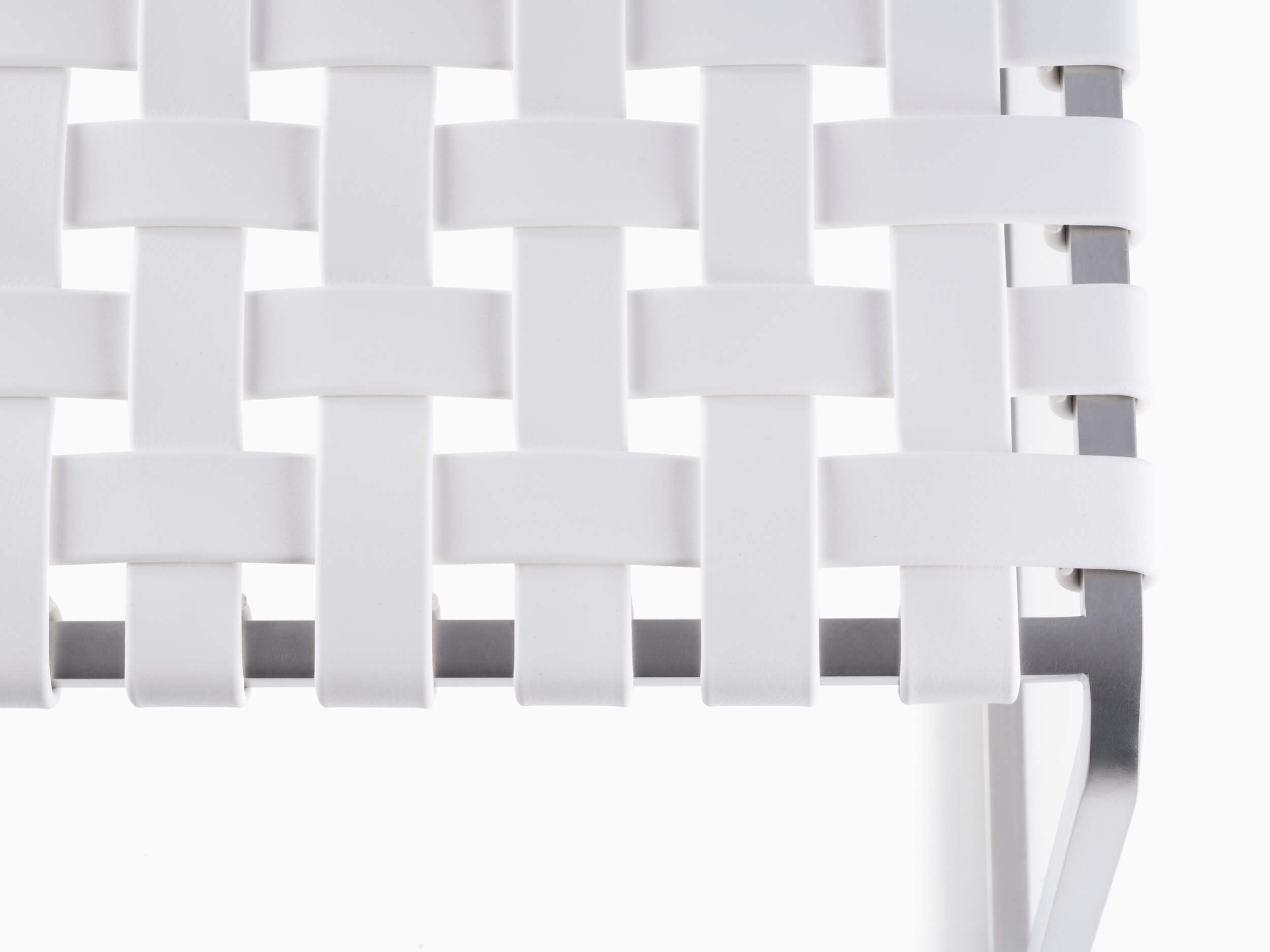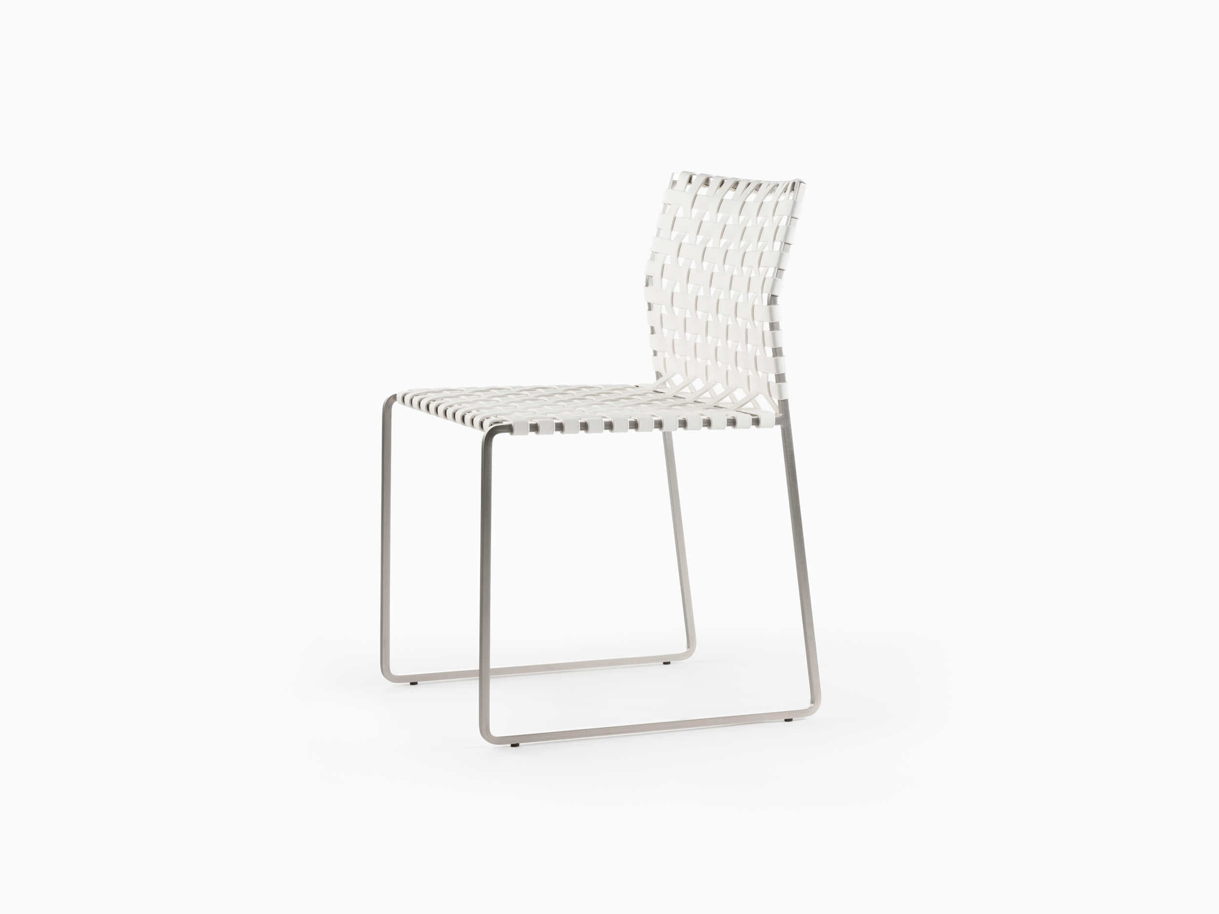 The outdoor side chair has a lighter frame than the standard side chair and is woven with UV resistant, waterproof, faux leather strapping.