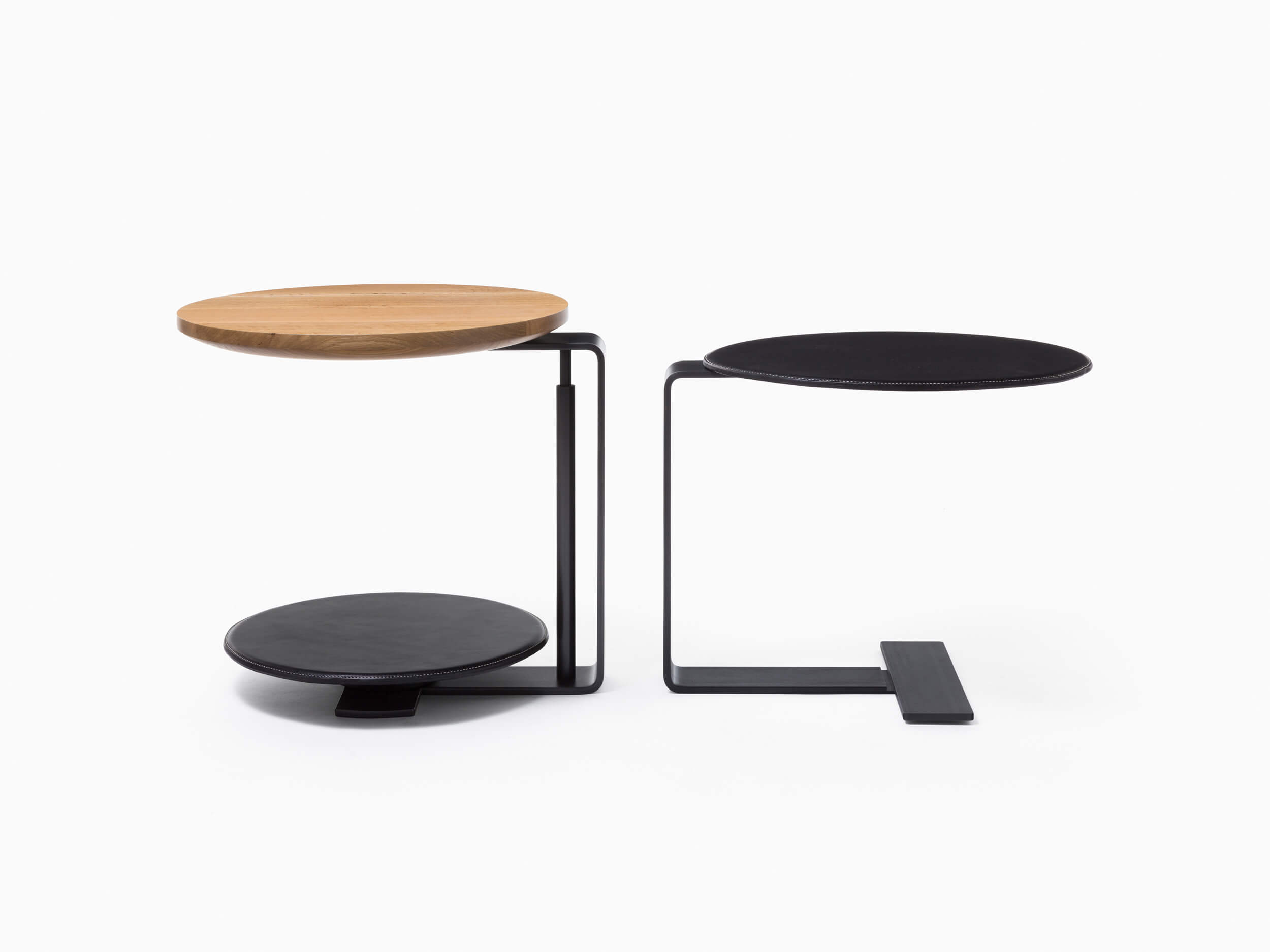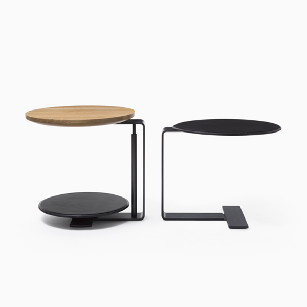 The combination of wood, steel and leather define this collection of tiered, utilitarian side tables.